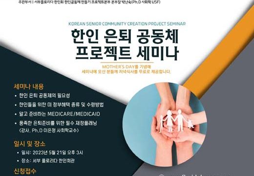 ‘한인은퇴 공동체 프로젝트 세미나’ 개최 서부플로리다한인회관, 5월 21일 오후3시 (탬파) 서부플로리다한인회(회장 신광수) 한인공동체 만들기 프로젝트 본부장인 박난숙 교수(Ph. D 사회학 / USF)는 오는 5월 21일(일) 오후 3시부터 서부플로리다한인회관에서 ‘한인은퇴 공동체 프로젝트 세미나’를 개최한다. 초청강사는 이은정 교수(Ph.D 사회학)로 세미나 내용은 ‘한인 은퇴 공동체의 필요성, 한인들을 위한 미 정부 혜택 종류 및 수령방법, 알고 준비하는 MEDICARE 와…