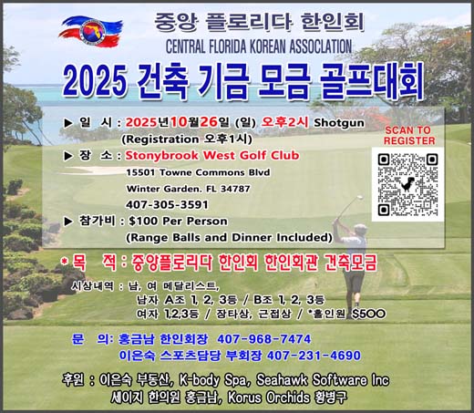 (올랜도) 중앙플로리다한인회(회장 홍금남)에서는 한인회관 건축을 위한 모금운동을 시작하면서 오는 10월 26일(일) 오후 2시에 Stonybrook West Golf Club(15501 Towne Commons Blvd. Winter Garden, FL 34787)에서 “2025 한인회관 건축 기금 모금 골프대회”를 개최한다.