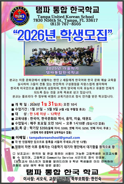 또한 탬파통합한국학교(교장 김진희/ 이사장 서오석)에서는 오는 2026년 1월 31일(토) 오전 9시반에 새학기를 시작한다며 신입생과 보조교사를 모집하고 있다.