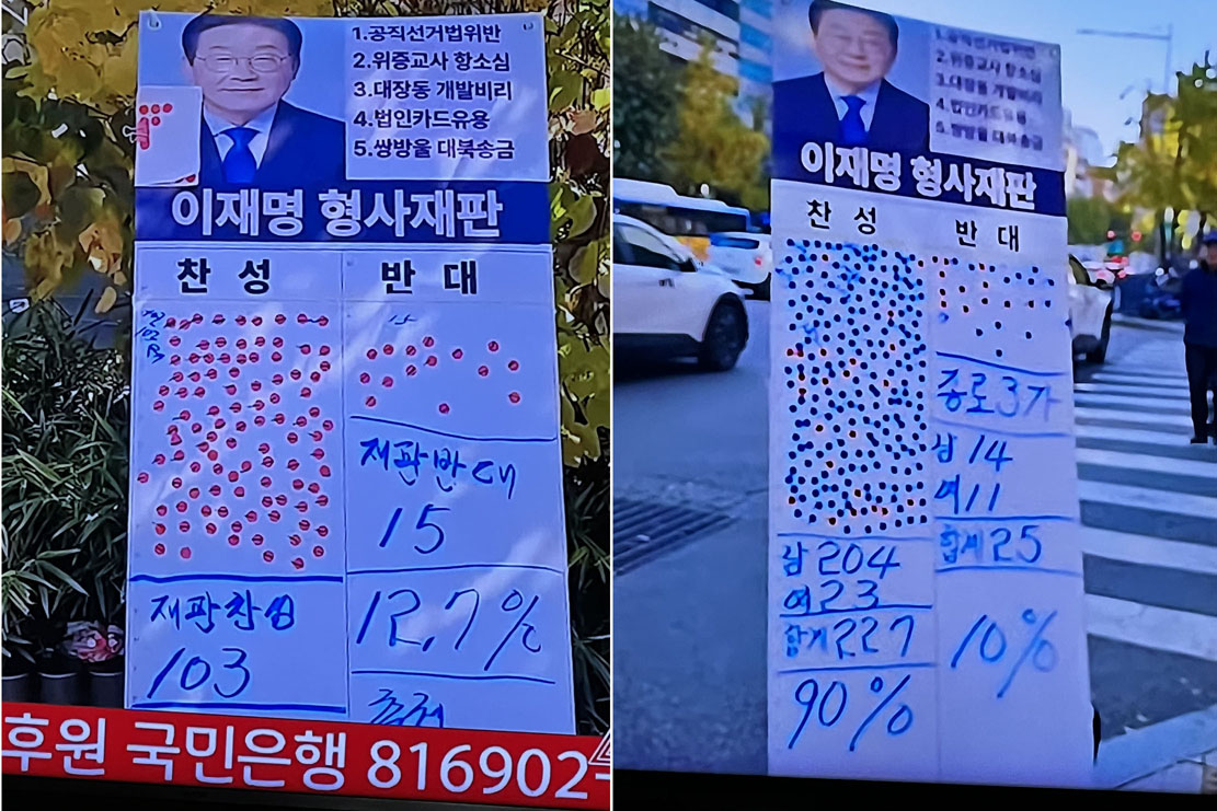 최근 서울의 이상구TV 유튜브 채널에서 며칠 전 춘천의 흥인시장과 11월10일 서울(종로3가)에서 이재명 형사재판(1. 공직선거법 위반 2. 위증교사 항소심 3. 대장동 개발 비리 4. 법인카드 유용 5. 쌍방울 대북송금)에 대한 국민들 여론조사를 길 가는 행인들을 대상으로 각각 1시간동안 직접 실시했다. 이러한 여론조사 결과를 소개하여 본다면, 춘천의 경우 총 118명중에 이재명 형사재판을 속개하고 재판을 진행하여야 한다는 찬성의 여론이 103명 (87.3%)이었고, 반대는 15명(12.7%)이었으며, 서울의 경우 총 252명 조사 중 찬성하는 사람이 227명(90%), 반대는 25명(10%)로 나타났다. 서울과 춘천을 합산하여 통계를 본다면 이재명 재판을 찬성하는 사람들이 압도적으로 많다. 이것이 현 대한민국 사회의 실상이고 여론(민심)이다.
