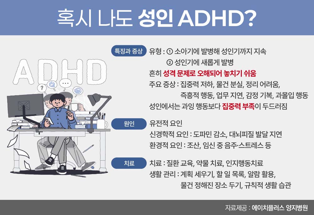 성인ADHD는 크게 두 가지로 구분할 수 있다. 하나는 소아기에 발병한 증상이 성인기까지 이어지는 경우이고, 다른 하나는 성인이 된 후 새롭게 발병하는 경우다. 대표적인 증상으로는 △한 가지 일을 끝내지 못함 △물건을 자주 잃어버림 △정리정돈이 어려움 △충동적 지출이나 즉흥적 행동 △지나친 감정 기복 △게임·음주·도박 과몰입 등이 있다.