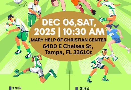 플로리다한인회연합회 체육대회 12월 6일 오전 10시반….Mary Help of Christian Center (탬파) 플로리다한인회연합회(회장 신승열)에서는 오는 12월 6일(토) 오전 10시반부터 탬파에 위치 있으며 탬파한인천주교회에서 이용하고 있는 Mary Help of Christian Center(6400 E. Chelsea St. Tampa, FL 33610)에서 개최한다. 서부플로리다한인회(회장 신광수), 북부플로리다한인회(회장 조경구), 중앙플로리다한인회(회장 홍금남), 남부플로리다한인회(회장 이종주)등 4개 도시의 팀이 참석할 예정인 이번 체육대회의 종목은 다음과 같다. 축구…