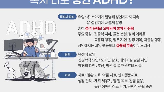 <휴람건강정보> 성인ADHD(주의력결핍 과잉행동장애) 일·관계·삶 모두 흔든다 흔히 아이들의 질환으로 알려져 있는 ADHD, 최근 들어서 성인 환자가 급격히 늘고 있다. 이번 주 휴람 의료정보에서는 휴람 의료네트워크 H+양지병원 정신건강의학과 정 성민 전문의의 도움을 받아 성인ADHD에 대해서 자세히 알아보고자 한다. 최근 진료실을 찾는 환자들 가운데 ‘업무에 집중이 잘 안돼요’ ‘사람들과 관계 맺기가 너무 힘들어요’, ‘시작한 일을 마무리 짓지…