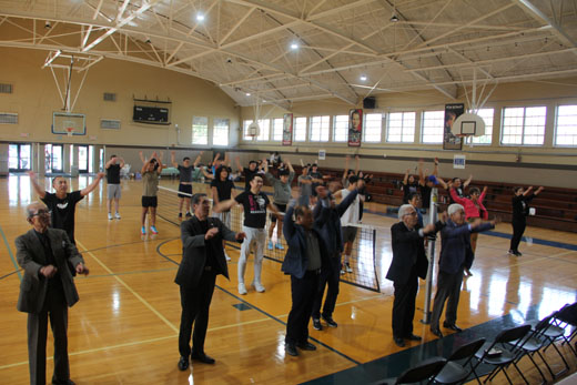 ▲ 체육대회 전 국민체조를 함께하는 선수들과 참석자들. 사진 좌측상단 왼쪽부터 신승열 회장과 신광수 차기회장.