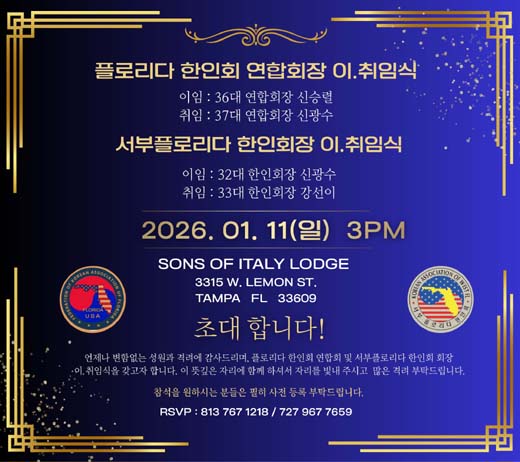 단 이날 행사를 준비하면서 성공적으로 이-취임식을 치루기 위해서는 참석을 원하시는 모든 동포들이 꼭 등록(813-767-1218/ 727-967-7659)을 해주실 것을 부탁하고 있다. <1485/20260107>