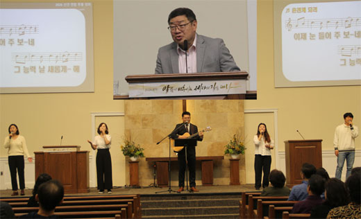▲ 말씀을 전하는 노진준 목사(중앙 상)와 찬양으로 영광 돌리는 신장희 목사와 연합찬양단원들.