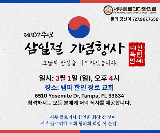 (탬파) 서부플로리다한인회(회장 강선이)와 서부플로리다교회협의회(회장 이순일 목사)가 공동주최하는 제107주년 3.1절 기념식이 오는 3월 1일(일) 오후 4시부터 탬파한인장로교회(목사 김정곤/ 6510 Yosemite Dr. Tampa, FL 33634)에서 개최된다.