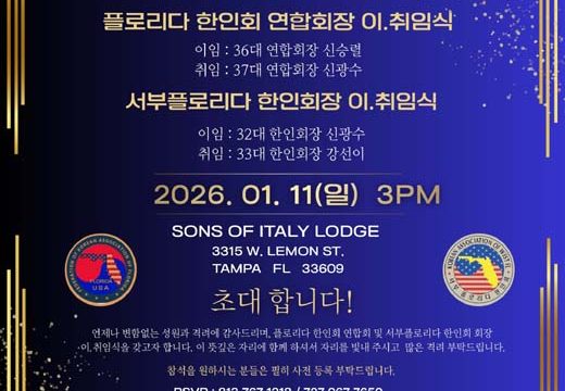 플로리다연합회장과 서부플로리다한인회장 이취임식 연합회장에 신광수. 한인회장에 강선이씨 취임 (탬파) 플로리다한인회 연합회장과 서부플로리다 한인회장의 이-취임식이 오는 1월 11일(일) 오후 3시부터 SONS OF ITALY LODGE(3315 W. Lemon St. Tampa. FL 33609)에서 공동으로 개최된다. 이날 플로리다한인회 연합회는 36대 신승열 회장이 이임하고 37대 신광수 회장이 취임하며, 서부플로리다한인회는 32대 신광수 회장이 이임하고 33대 회장에는 강선이씨가 취임하게 된다. 연합회와 한인회 관계자들은…