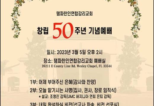 창립 50주년 기념예배 및 임직식 탬파한인연합감리교회… 3월 5일 오후 2시 (탬파) 탬파베이지역의 한인동포들에게 복음을 전한지 50주년을 맞이하는 탬파한인연합감리교회(목사 한명훈)에서는 오는 3월 5일(일) 오후 2시부터 창립 50주년 기념예배 및 임직식을 함께 갖는다. 교회 관계자는 이번 창립 50주년 기념에 탬파베이지역의 많은 동포들이 참석해 축하도 해주시고 또 말씀에 은혜를 받는 복된 시간이 되기를 소망한다며 모든 동포들을 초청하고 있다.…