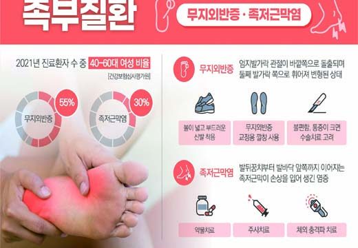 <휴람건강정보> 산책과 운동 방해하는 대표 족부질환은? 최근 건강에 좋은 산책, 조깅 야외 운동을 즐기는 이들이 많아졌다. 하지만 무지외반증과 족저근막염 등 족부질환 때문에 걷는게 부담스럽고 고통스러운 이들도 존재한다. 이번 주 휴람의료정보에서는 휴람 의료네트워크 H+양지병원 정형외과 김 재영 과장의 도움을 받아 족부질환에 대해 자세히 알아보고자 한다. 무지외반증과 족저근막염은 주로 중장년층 여성이 많이 걸린다. 실제로 건강보험심사평가원 자료에 따르면…