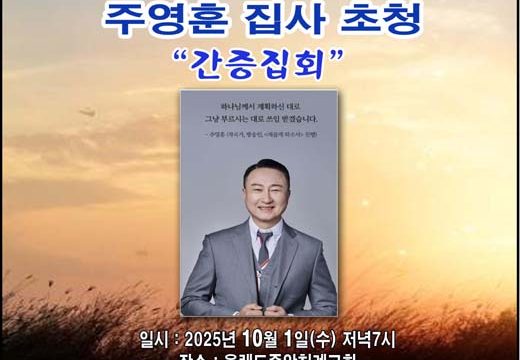 ‘새롭게 하소서’ 진행, 가수 주영훈 집사 간증 집회 10월 1일 7시 …. 올랜도 중앙침례교회 (올랜도) 한국에서 가수와 작곡가 그리고 방송인으로 큰 사랑을 사랑을 받고 있는 주영훈 집사가 오는 10월 1일(수) 오후 7시부터 올랜도 중앙침례교회(담임 김선국 목사)에서 “하나님께서 계획하신 대로 그냥 부르시는 대로 쓰임 받겠습니다”라는 주제로 간증집회를 갖는다. 중앙침례교회 김선국 담임목사는 이번 집회에 많은 성도들이 참석해…