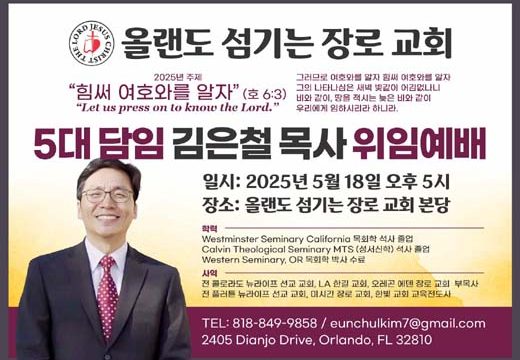 섬기는장로교회 “김은철 목사” 위임예배 2025년 5월 18일 오후 5시….. 본당에서 (올랜도) 올랜도 섬기는장로교회(2405 Dianjo Dr. Orlando, FL 32810)에서는 오는 5월18일(일) 오후5시부터 새로 부임한 김은철 목사의 위임 예배를 드릴 예정이라며 이 복된 자리에 모든 믿음의 형제자매들을 초청해 함께 은혜받기를 소망하고 있다. 섬기는 장로교회에 제5대 담임목사로 취임하는 김은철 목사는 그동안 지역사회에 말씀을 전해 온 이재룡 목사의 은퇴로…