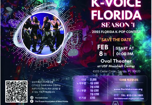 제4회 K-Voice Florida 축제 개최 2025년 2월 8일 오후 1시… USF MARSHALL CENTER (탬파) 서부플로리다한인회 신광수 회장은 지난 9월과 10월 두차례 있었던 태풍 및 자연재해로 인해 폐쇄된 공연장 문제로 공연이 연기됐던 제4회 K-Voice Florida 축제를 오는 2월 8일(토) 오후 1시부터 갖는다고 알려왔다. 공연 장소는 USF(University of South Florida) 소재 Oval Theatre(4103 Cedar Circle, Tampa, FL…