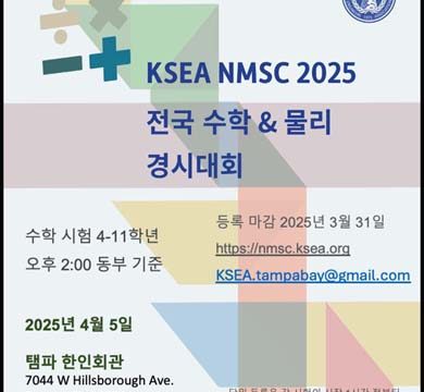 2025년 재미과학자협회 주최 수학경시대회 4월 5일 2시… 서부플로리다한인회관에서 (탬파) 재미한인과학기술자협회(Korean-American Scientists and Engineers Association / 이하 KSEA)에서 차세대 과학기술자 양성을 목표로 꾸준히 개최하고 있는 2025년 전국수학경시대회가 탬파베이 지억에서는 서부플로리다한인회 주최로 오는 4월 5일(토) 오후 2시부터 서부플로리다 한인회관(7044 W. Hossbrough Ave. Tampa, FL 33634)에서 개최된다. 4학년부터 11학년까지인 초-중-고 학생들에게 수학과 과학을 공부하도록 동기를 부여함과 동시에 한-미…
