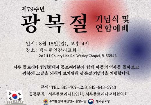 79주년 광복절 기념식… 한인회와 교협 공동주최 8월 18일 오후 4시, 탬파한인감리교회 (탬파) 서부플로리다 한인회(회장 신광수)와 서부플로리다 교회협의회(회장 신장희 목사)가 공동으로 주최하는 제79주년 광복절 기념식이 오는 8월18일(일) 오후 4시부터 탬파한인감리교회(담임목사 한명훈)에서 개최된다. 광복절 기념식 제1부는 교회협의회 주관 광복절 기념예배, 제2부는 한인회 주관으로 79주년 광복절 기념식을 갖는다. 신광수 한인회장은 서부플로리다지역의 동포여러분들과 함께 아픔의 역사를 돌아보고 광복의 그날을…