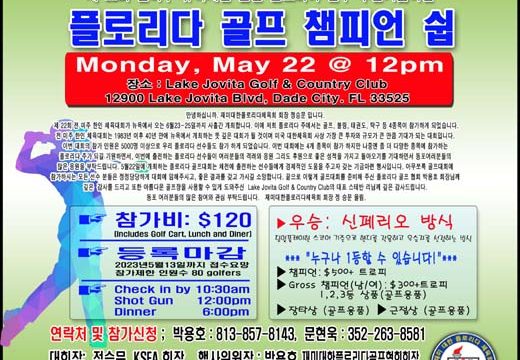 뉴욕 미주한인체육대회 출전선수 선발 골프대회 재미대한플로리다체육회… 5월 22일 낮 12시 (탬파) 재미대한플로리다체육회(회장 정승문)에서는 오는 6월 23일(금)부터 25일(일)까지 사흘간 뉴욕 롱아일랜드 나소 콜리세움 인근 나소 운동장에서 개최되는 제22회 전미주한인체육대회에 플로리다 대표를 참석시키기 위해 준비하고 있다. 정승문 회장은 경기종목(양궁, 배드민턴, 야구, 소프트볼, 축구, 볼링, 골프, 검도, 족구, 마라톤, 사격, 농구, 씨름, 수영, 탁구, 태권도, 테니스, 육상, 배구,…